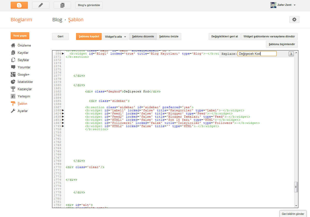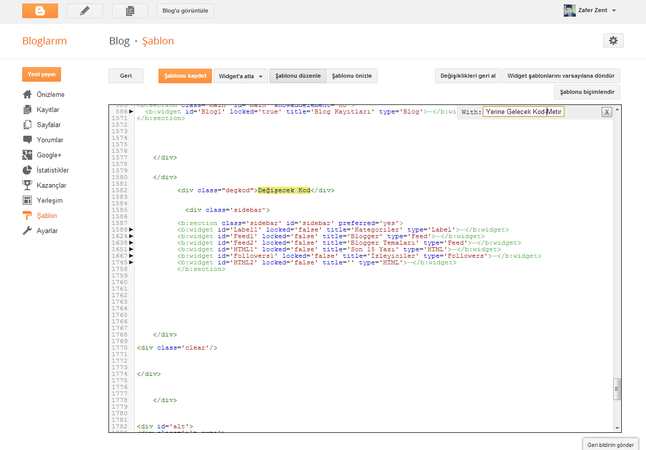 Şablon editörüne has bir de arama özelliği getirilmiş. Tarayıcılarla kod aramak biraz sıkıntı bir durumdu editöre has arama özelliğinin olması da güzel olmuş. Editörün arama özelliğini açmak için editörde (kodlar içerisinde) herhangi bir yere tıkladıktan sonra Ctrl + F tuşlarını kullanarak editörün sağ üst köşesinde açıldığını görebilirsiniz.